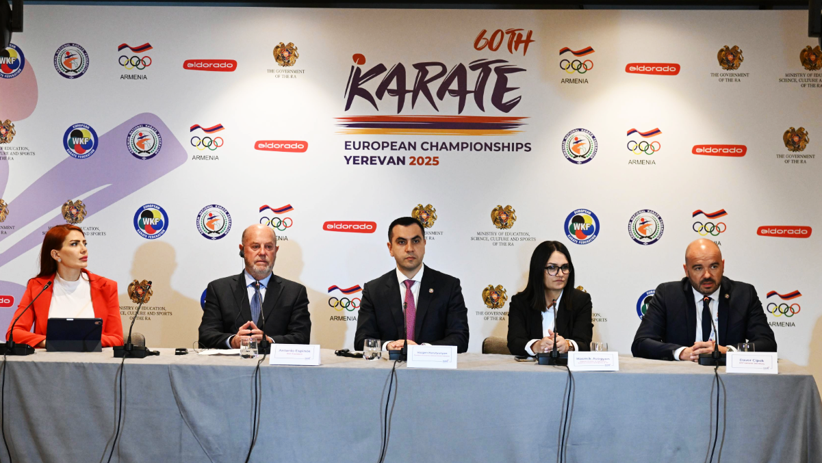 The press conference was led by Antonio Espinós, President of the European Karate Federation (EKF) and the World Karate Federation (WKF), alongside Vazgen Harutyunyan, President of the Armenia Karate Federation. They were joined by Hasmik Avagyan, Deputy Minister of Education, Science, Culture and Sports of Armenia, and EKF General Secretary Davor Cipek.